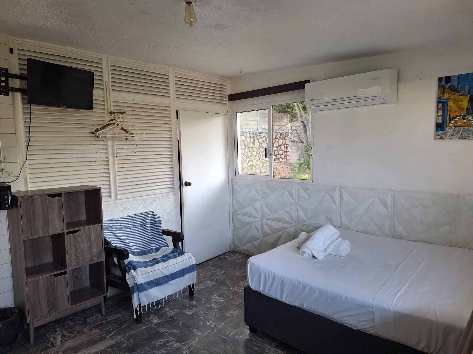 Habitacion hasta 2 personas, con aire acondicionado, baño privado con regadera , tv con netflix y youtube, vista al mar, acceso a cocina integral, alberca, conmdedores etc